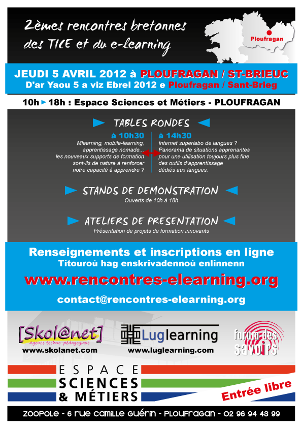 La seconde table ronde, à partir de 14h30 mettra en scène Sylvain Vacaresse, Maître de conférences associé, université de Rennes 1 et Directeur de LearningSalad, Guillaume Olivieri, Responsable commercial, Genious Interactive et Georges Prigent, Ingénieur e-formation, Luglearning. Les invités débattront sur l’état des lieux en matière d’apprentissage nomade et des perspectives dans le domaine du mobile learning (mlearning).