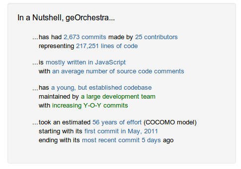 code (save external dependencies) is periodically analysed by Ohloh. The geOrchestra community