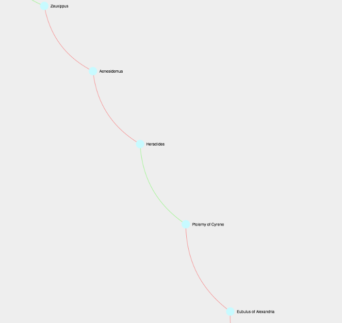 La visualisation des liens maître-élève des philosophes antiques que je dévoile tire partie des opportunités inédites de Wikidata. Les liens entre philosophes sont en effet colorés selon la probabilité de la relation : d’hypothétique (rouge) à quasi-certain (vert). La succession pyrrhonienne de Diogène Laërce peut ainsi être mentionnée, tout en restant ferment cantonnée dans son statut de lignée hypothétique.