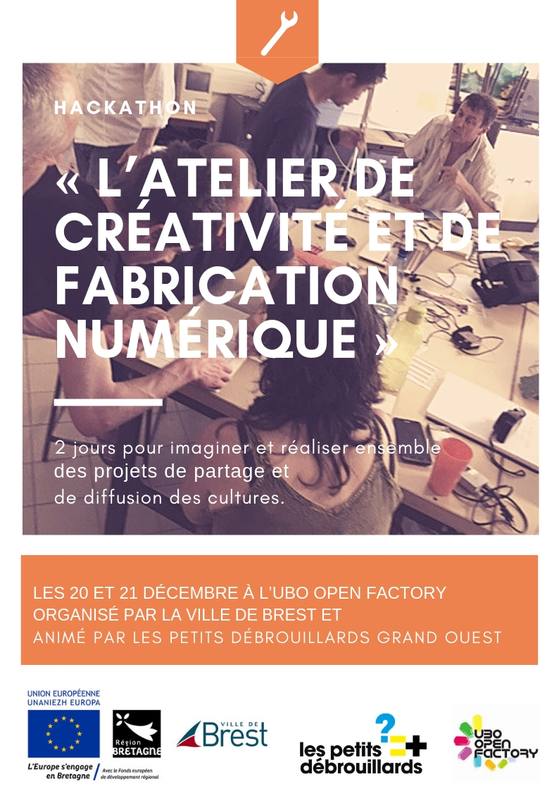 La ville de Brest souhaite organiser un temps de formation structurée comme un hackathon (marathon créatif) de deux jours fin décembre (20 et 21/12) à destination des animateurs, des médiateurs numériques, et agents des médiathèques et des milieux éducatifs, culturels, du social, environnement . Ce temps sera animé par les petits débrouillards Bretagne et se déroulera à l’UBO Open Factory.