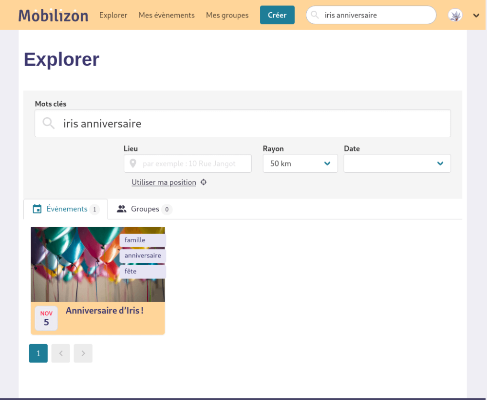 Rȯse va sur son instance Mobilizon, mais n’y voit pas l’événement créé par son père. Elle se rend compte qu’il s’est inscrit sur un autre site web Mobilizon, une autre instance. Heureusement, ces instances sont fédérées : depuis la barre de recherche de son instance à elle, Rȯse peut trouver l’événement que son père a créé sur son instance à lui.