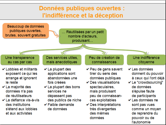 Les données publiques sont si nombreuses, complexes, hétérogènes, difficiles à interpréter, que très peu d’acteurs parviennent à réunir le courage ou les ressources pour les travailler sérieusement. Les premières applications que nous voyons aujourd’hui candidater à des concours tels qu’Apps for Democracy ou Show Us a Better Way en restent à l’état d’aujourd’hui, celui de prototypes, rarement exploitables par des citoyens ordinaires. La plupart ne se convertissent jamais en services opérationnels. De magnifiques visualisations font plus pour la célébrité de leurs concepteurs que pour créer une compréhension partagée de phénomènes complexes. Seuls quelques lobbies plon ! gent dans les données, pour en ramener les résultats qu’ils savaient vouloir y trouver, et sans grand risque de trouver contradicteur. Après quelques contributions sur des sites comme FixMyStreet, les citoyens se fatiguent de faire le boulot qu’ils attendent de leurs municipalités, surtout quand celle-ci est plus indifférente que réactive. L’ouverture des données publiques ne fait pas beaucoup de mal, mais pas beaucoup de bien non plus.